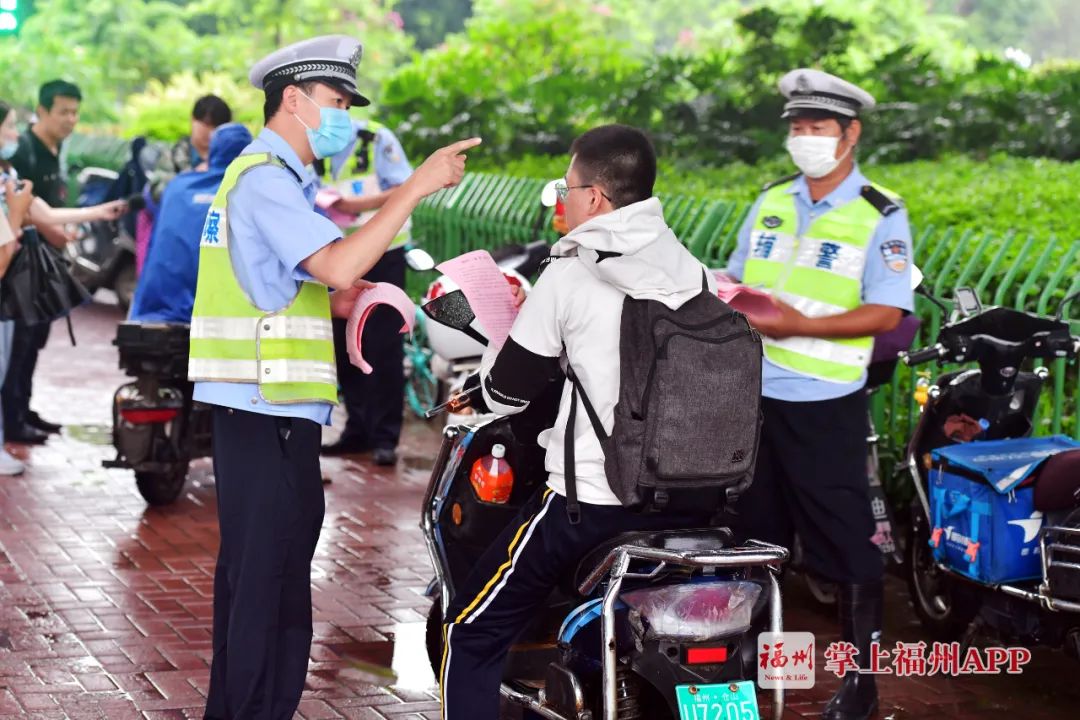 民警提醒電動車騎行者佩戴安全頭盔。陳暖/攝